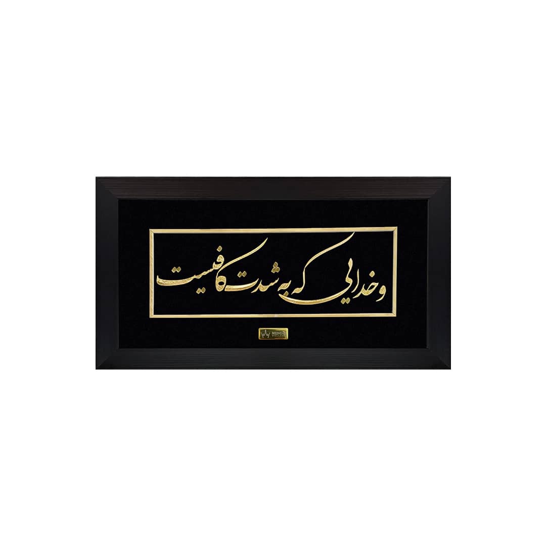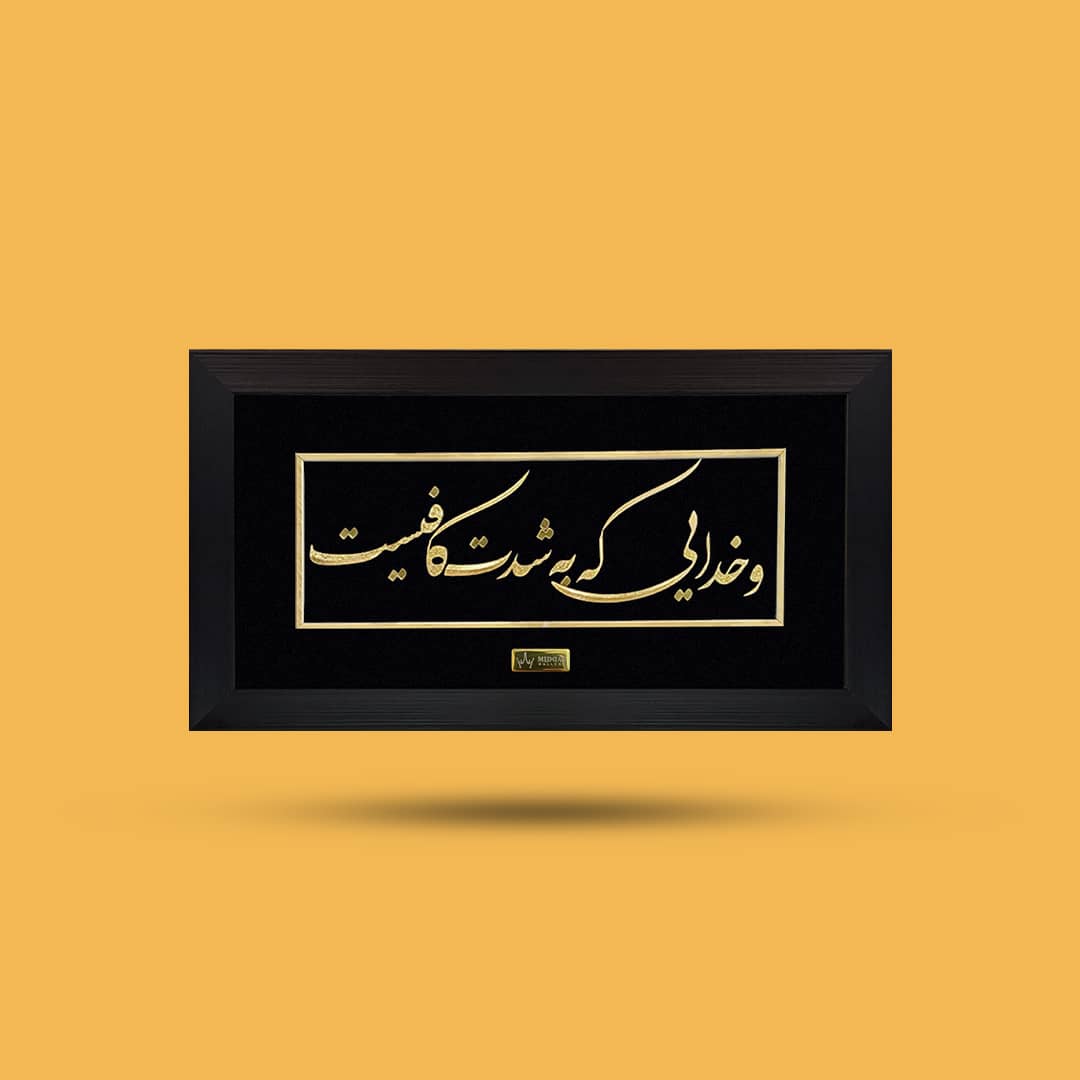 تابلو طلا شعر و خدایی که به شدت کافیست  با طرحی بی نظیر و با پوشش طلای 24 عیار به تصویر در آمده است . در ساخت قاب این تابلو طلاکوب ، از مرغوب ترین مواد استفاده شده که ظاهری دلنشین به آن بخشیده است . مواد استفاده شده در این تابلو از بالاترین کیفیت بر خوردارند و همواره به زیبایی این شعر می افزاید.