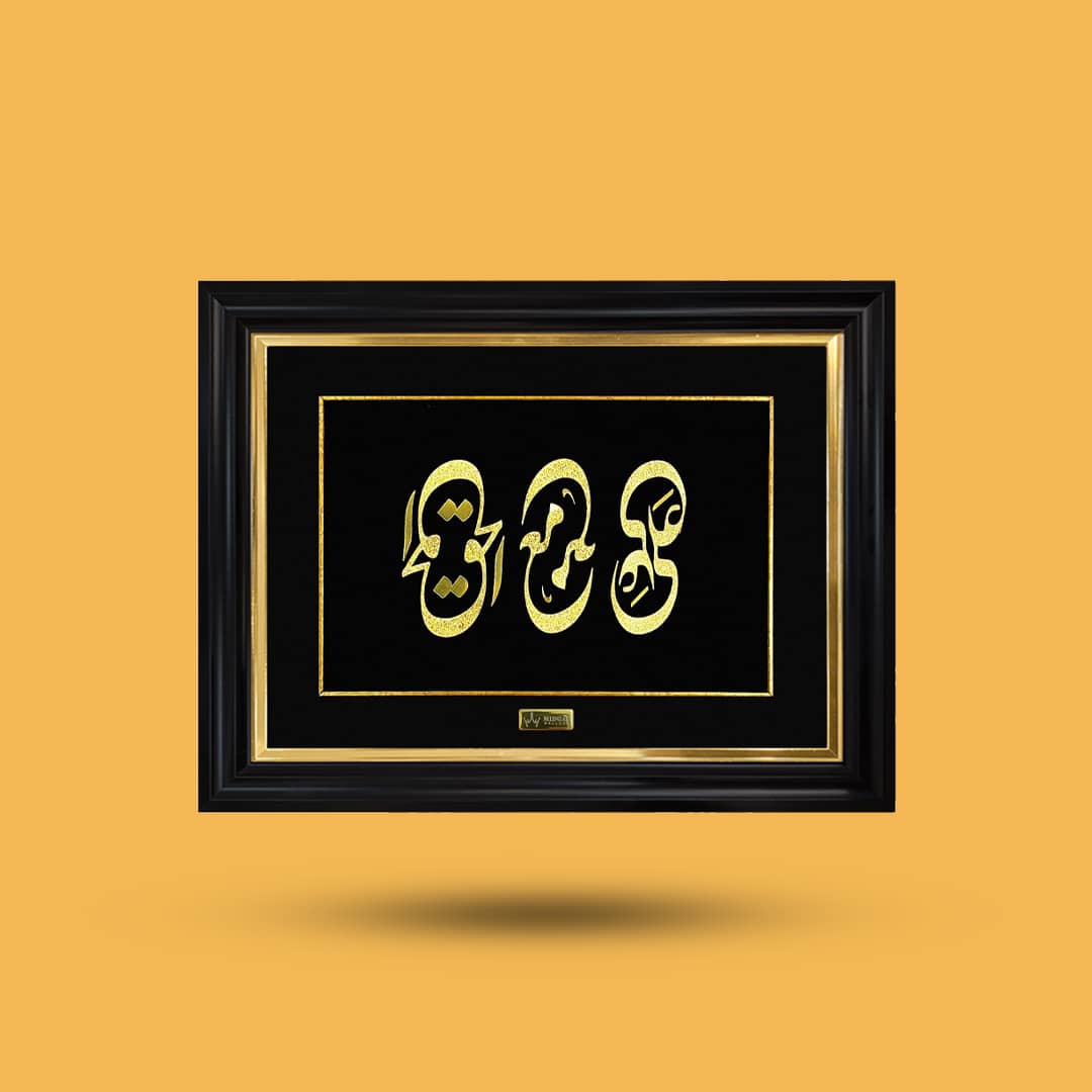 تابلو ورقه طلا حدیث علی معالحق با طرحی هنرمندانه و با پوشش طلای 24 عیار به تصویر در آمده است . در ساخت قاب این تابلو ورقه طلا ، از مرغوب ترین مواد استفاده شده که ظاهری دل نواز به ارمقان می آورد .